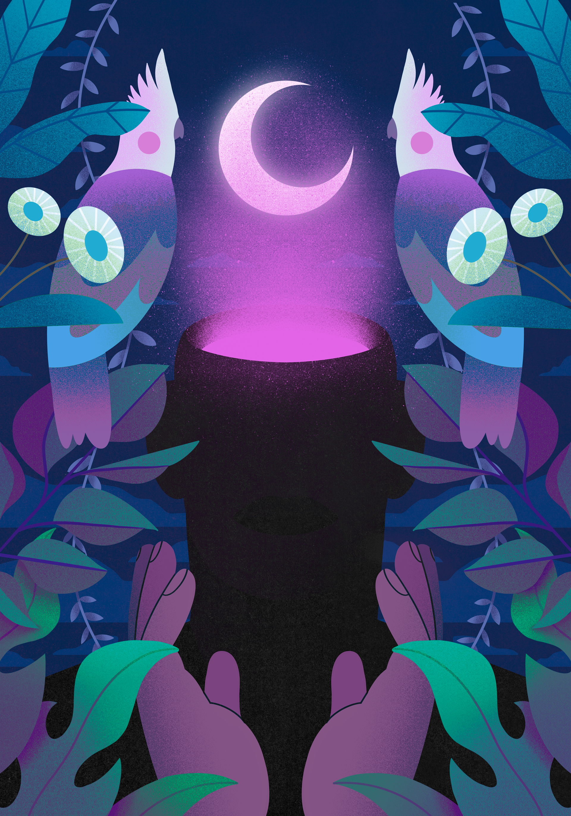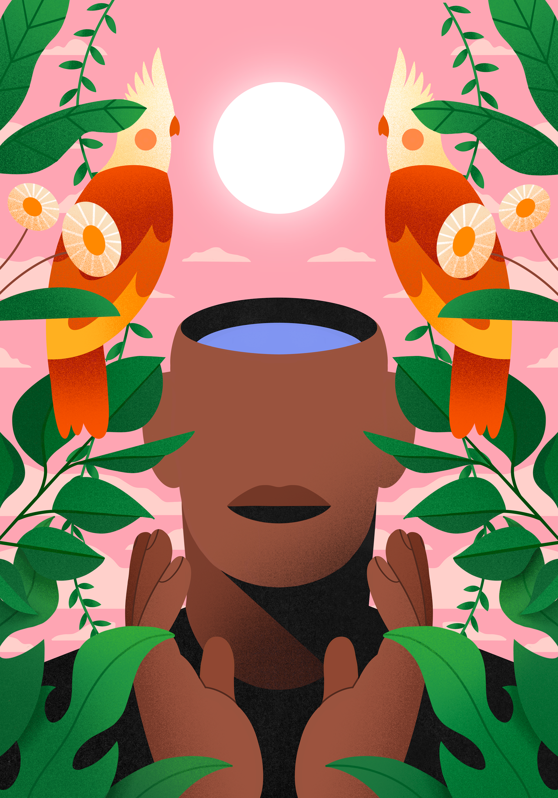 Ilustrações pessoais no Procreate sobre a influência da conexão com a natureza na saúde mental e na renovação diária de pensamentos, ideias, conceitos e energias para um novo ciclo diário.