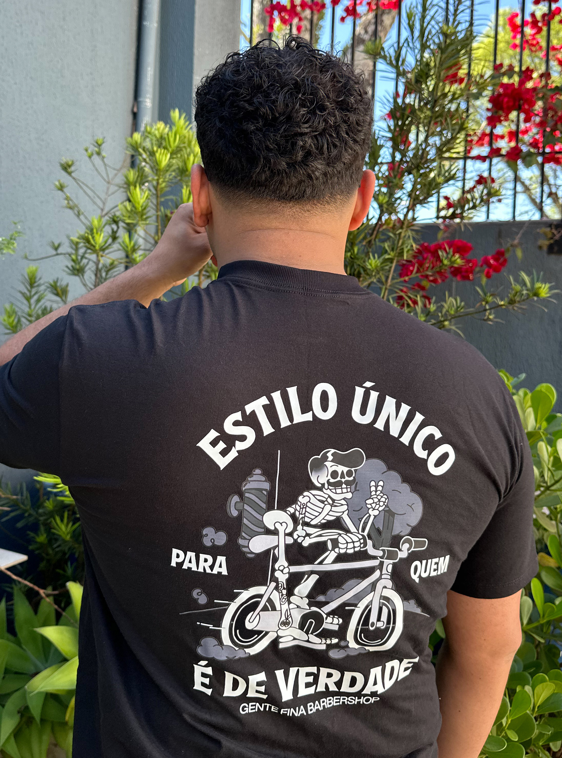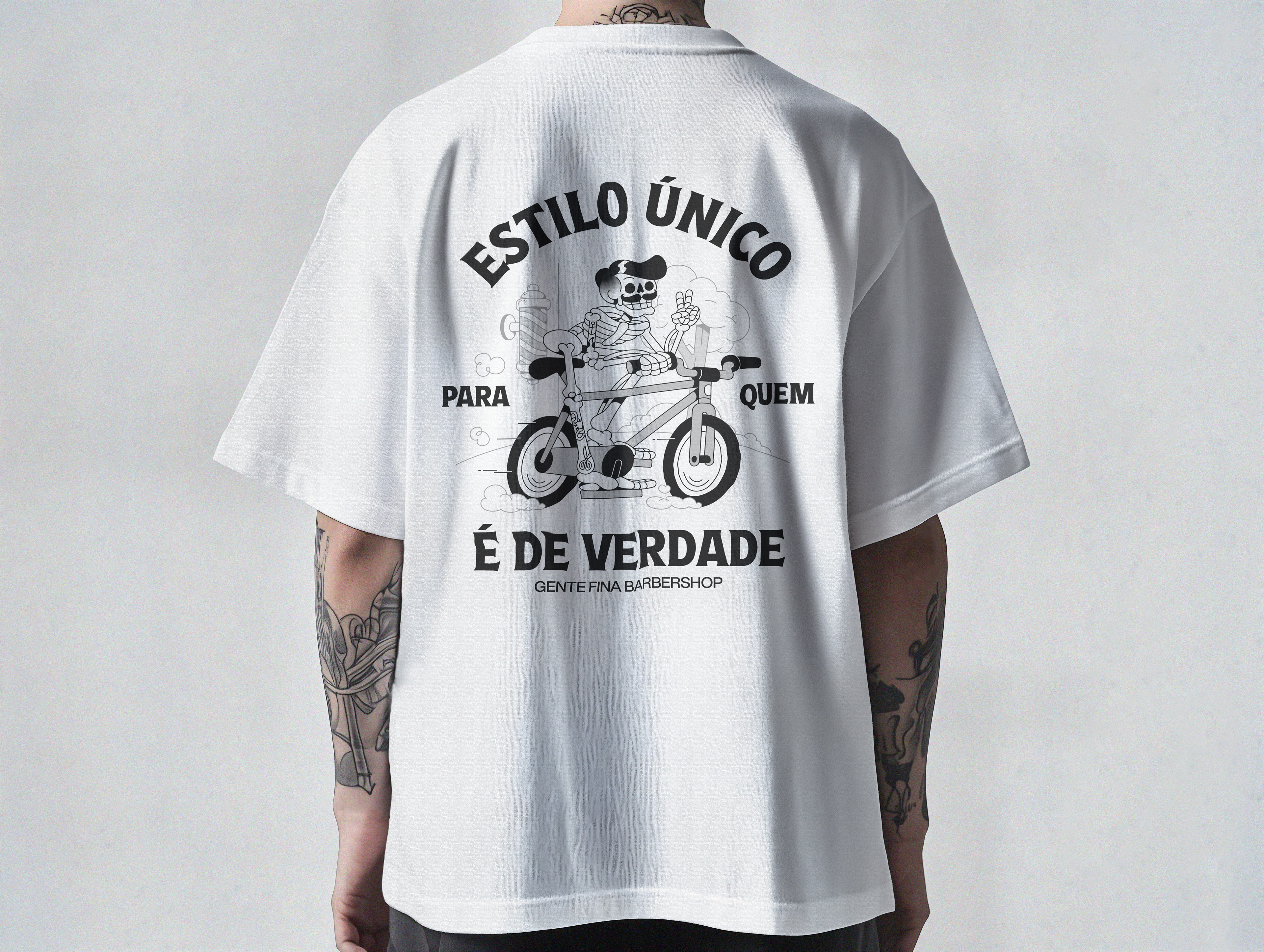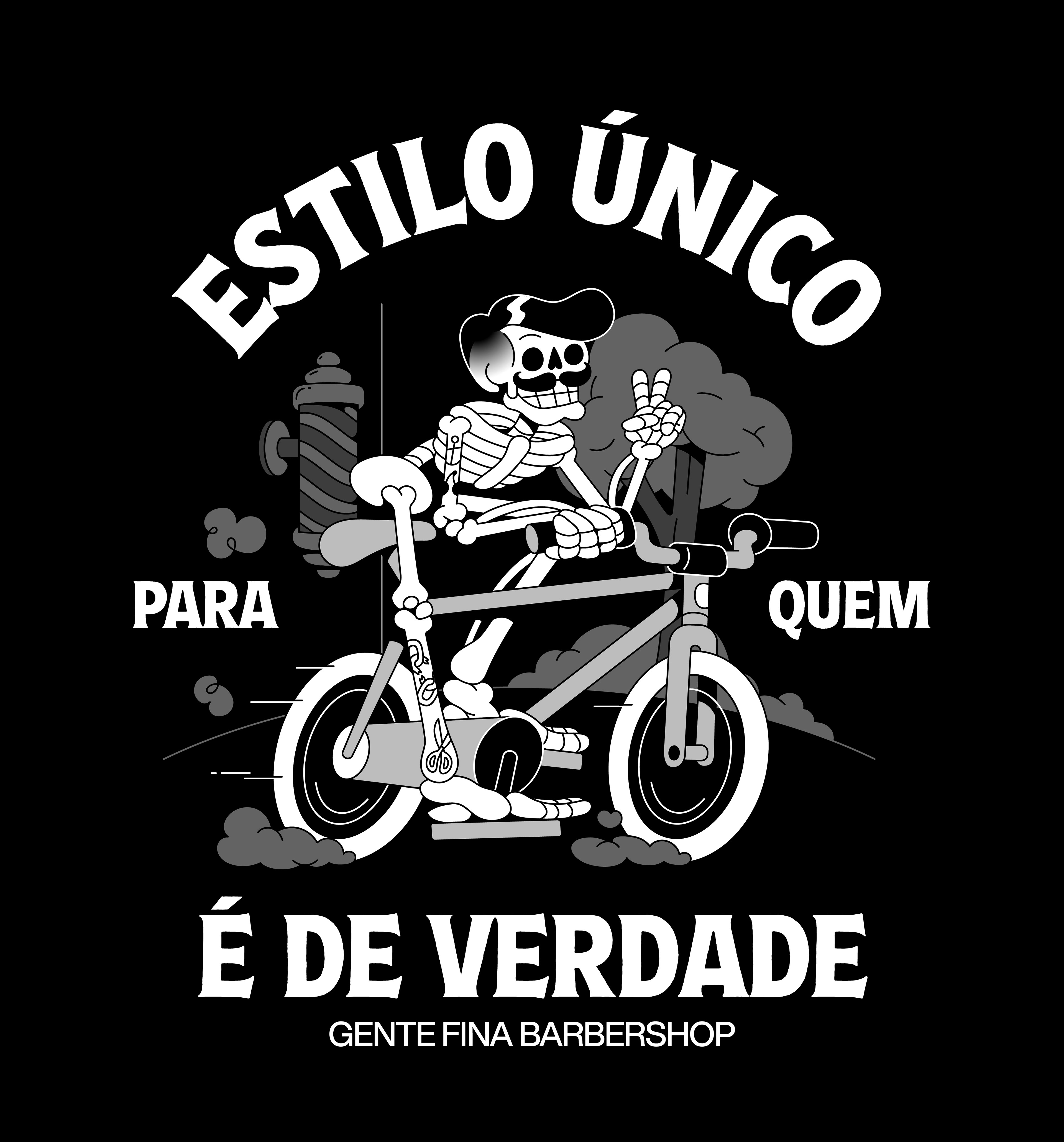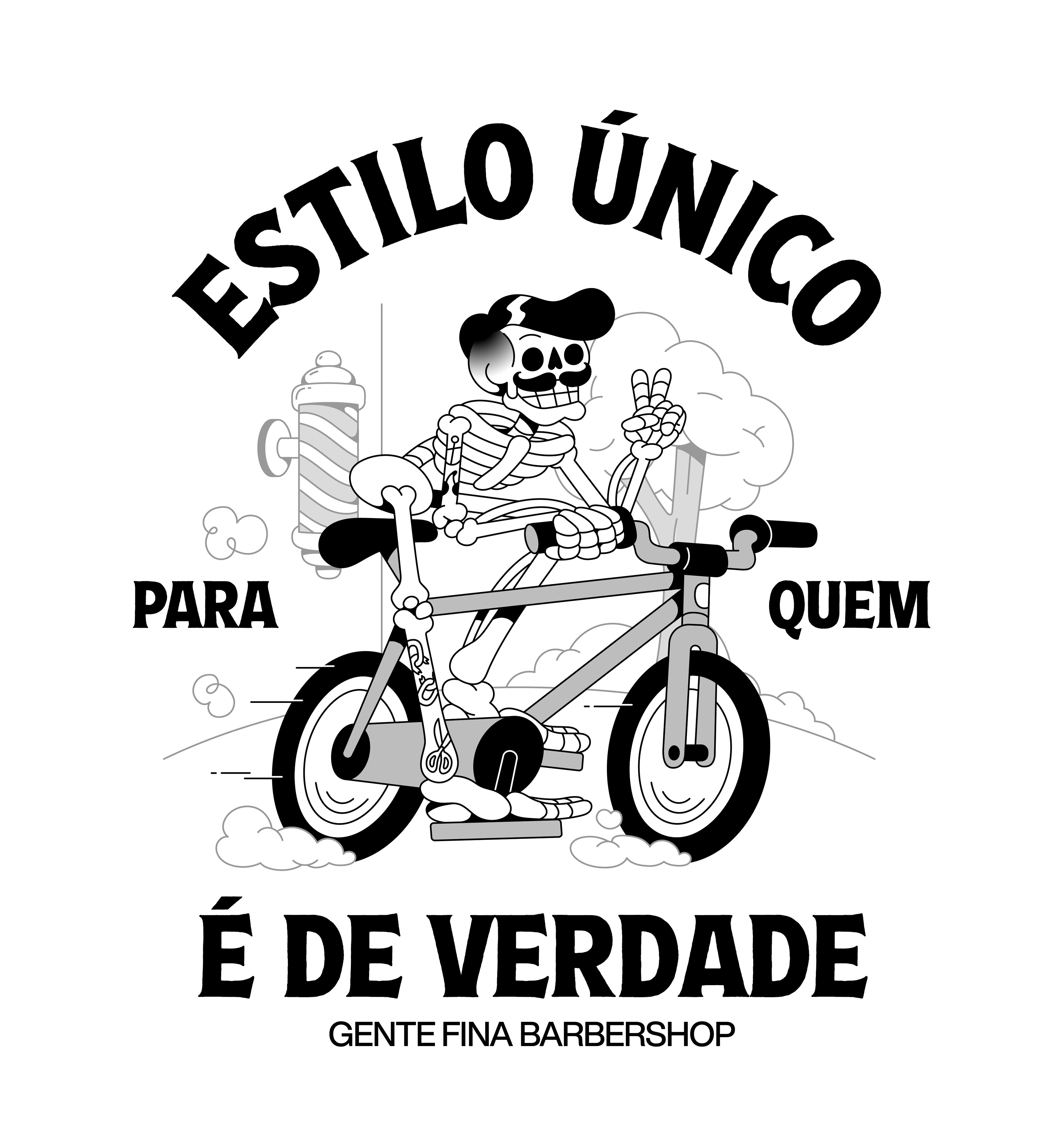 Em 2025, fui chamado para elaborar uma estampa para a barbearia Gente Fina. A proposta era unir o símbolo da barbearia, que é uma caveira, com o lifestyle urbano que tem tudo a ver com o público-alvo. O objetivo foi criar uma estampa que traduzisse autenticidade e movimento através de uma estética cartoon retrô.