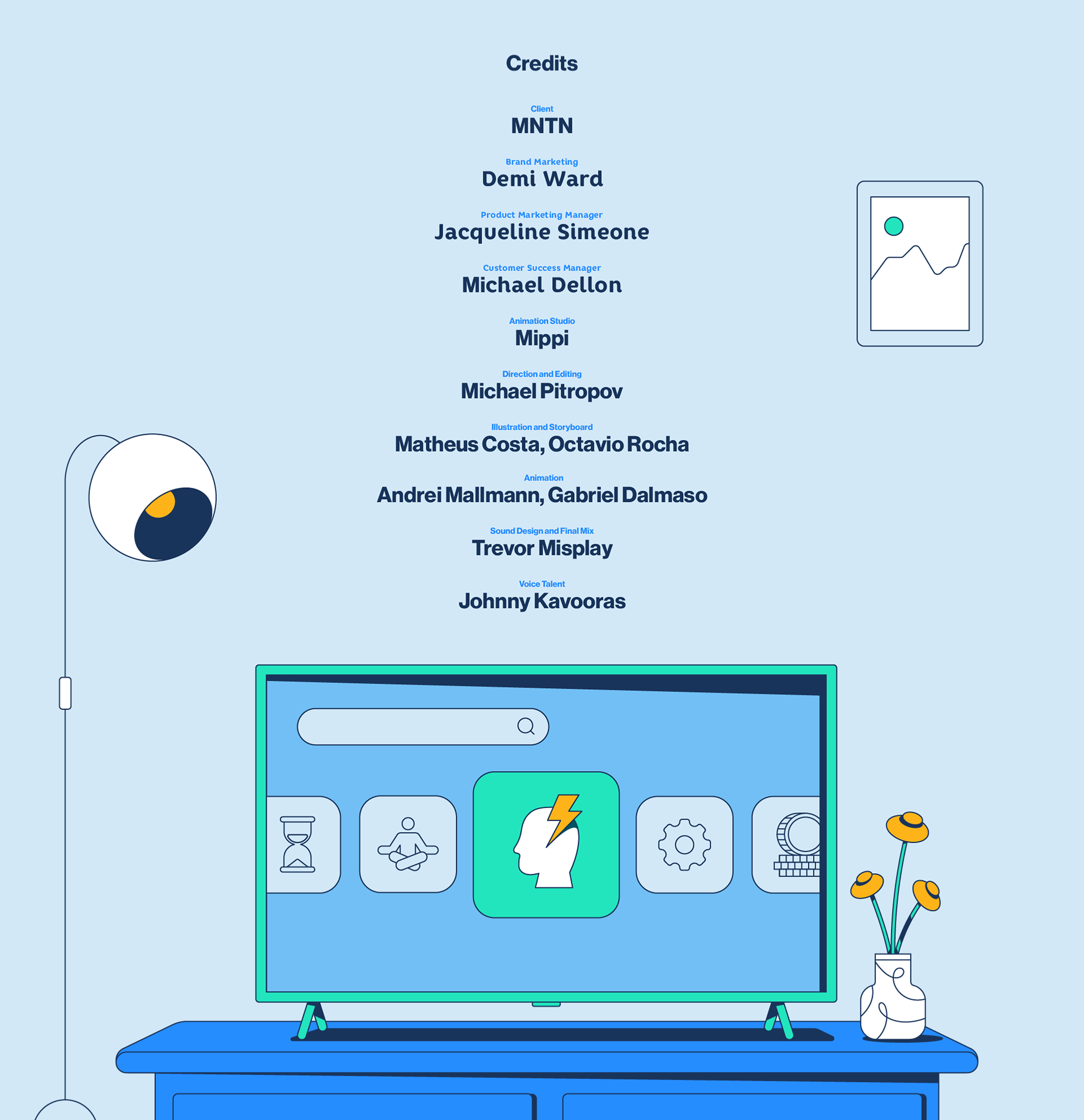 A Mippi me convidou para assinar o storyboard e as ilustrações vetoriais deste projeto para a MNTN. O objetivo foi dar vida à plataforma que está revolucionando a publicidade em TV Conectada, unindo agilidade e qualidade profissional por meio de um visual moderno e transições fluidas.