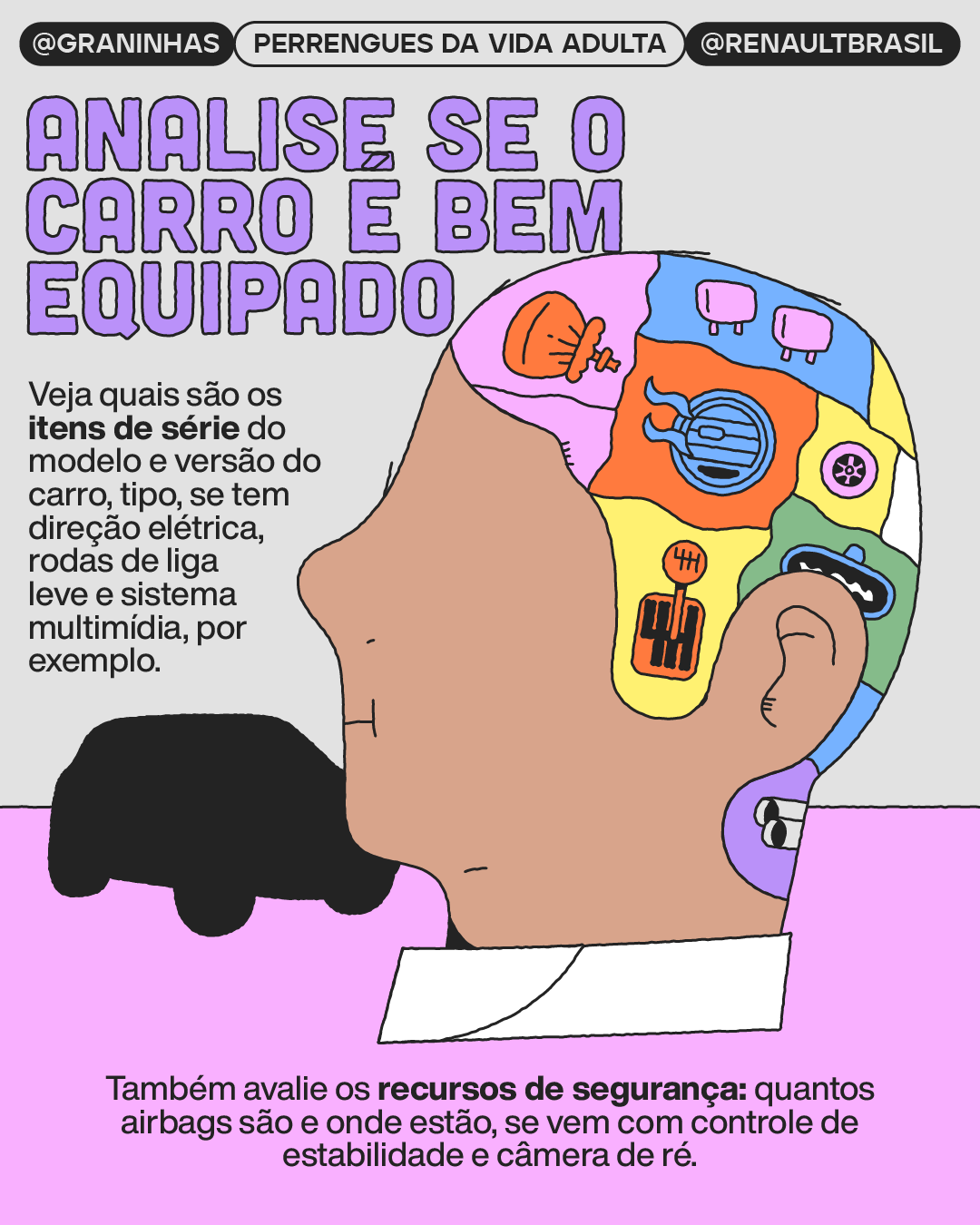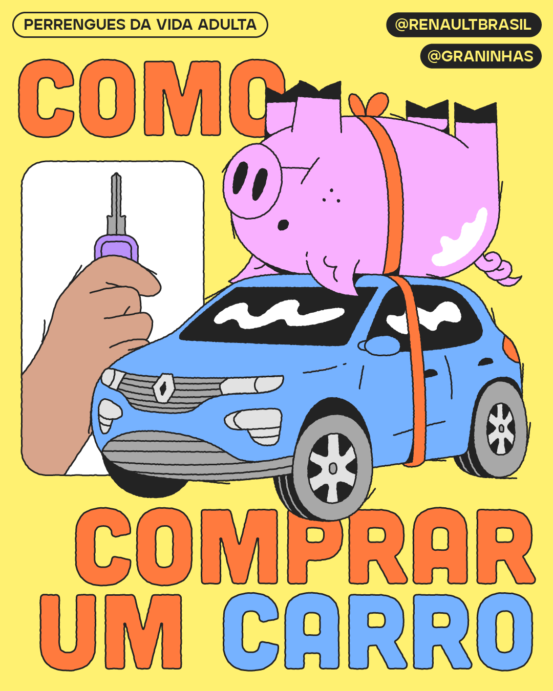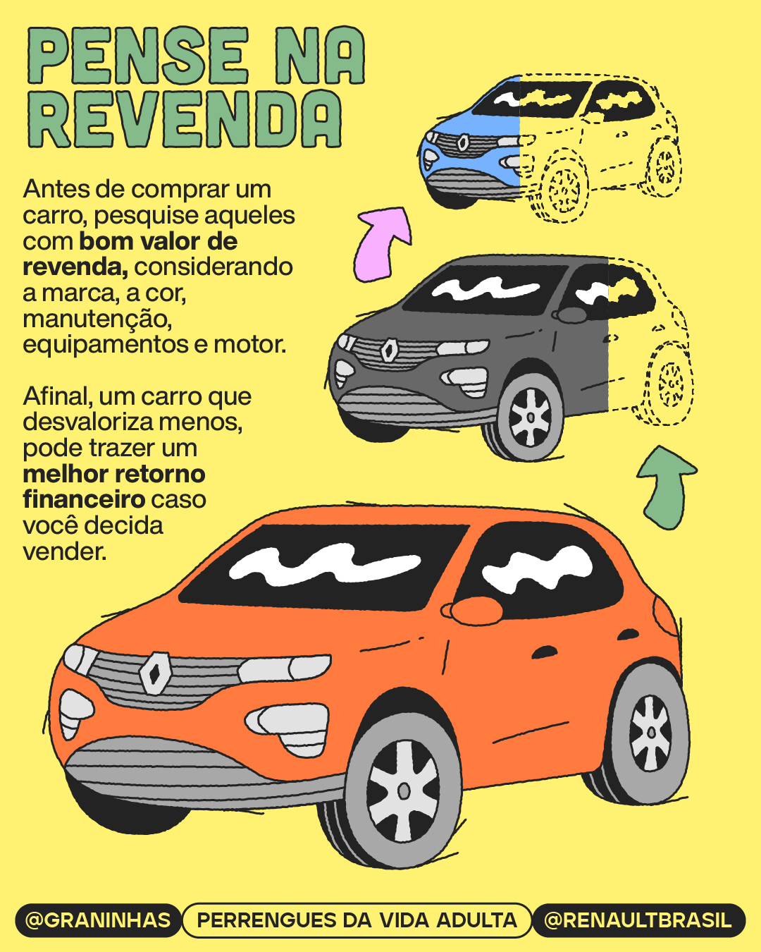 Ilustrações e diagramação em carrossel para redes sociais produzidos para a collab Graninhas + Renault Brasil no Instagram.
