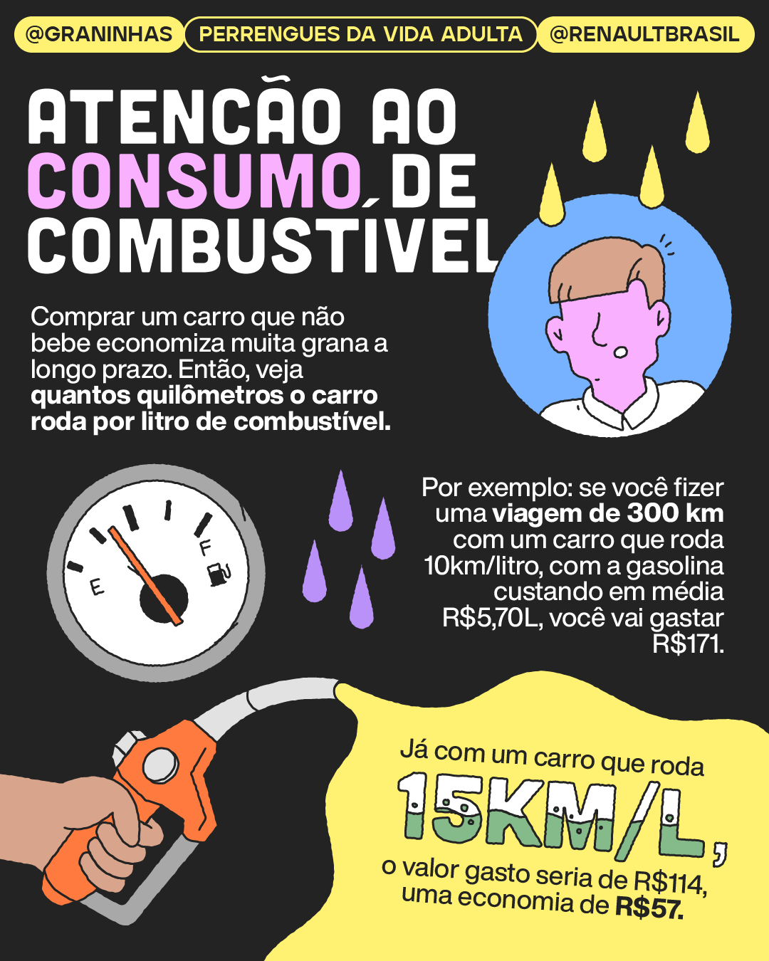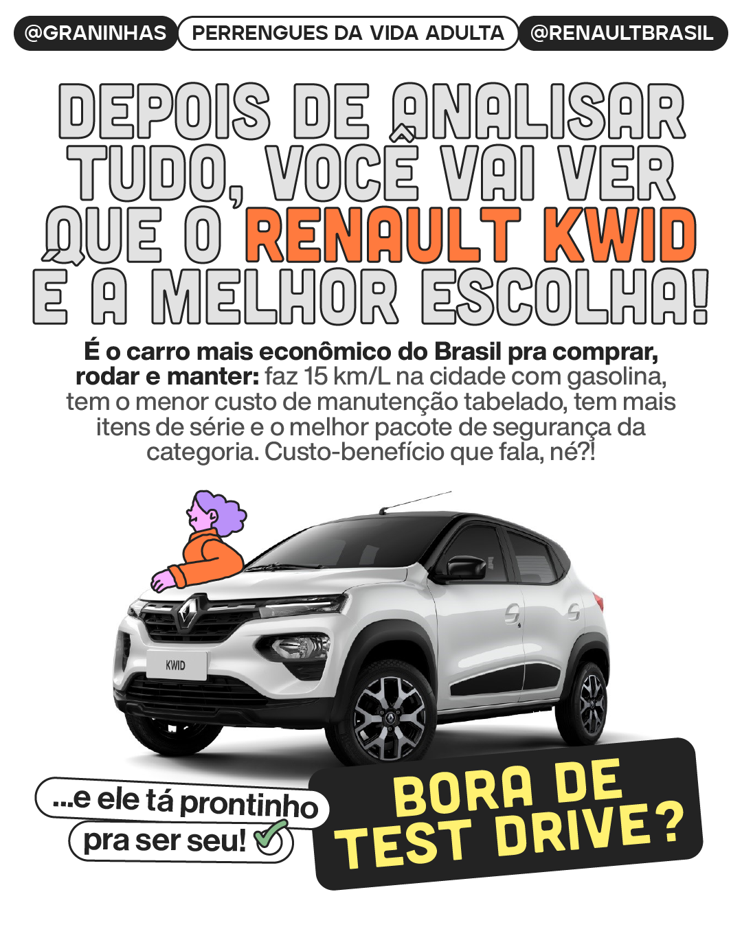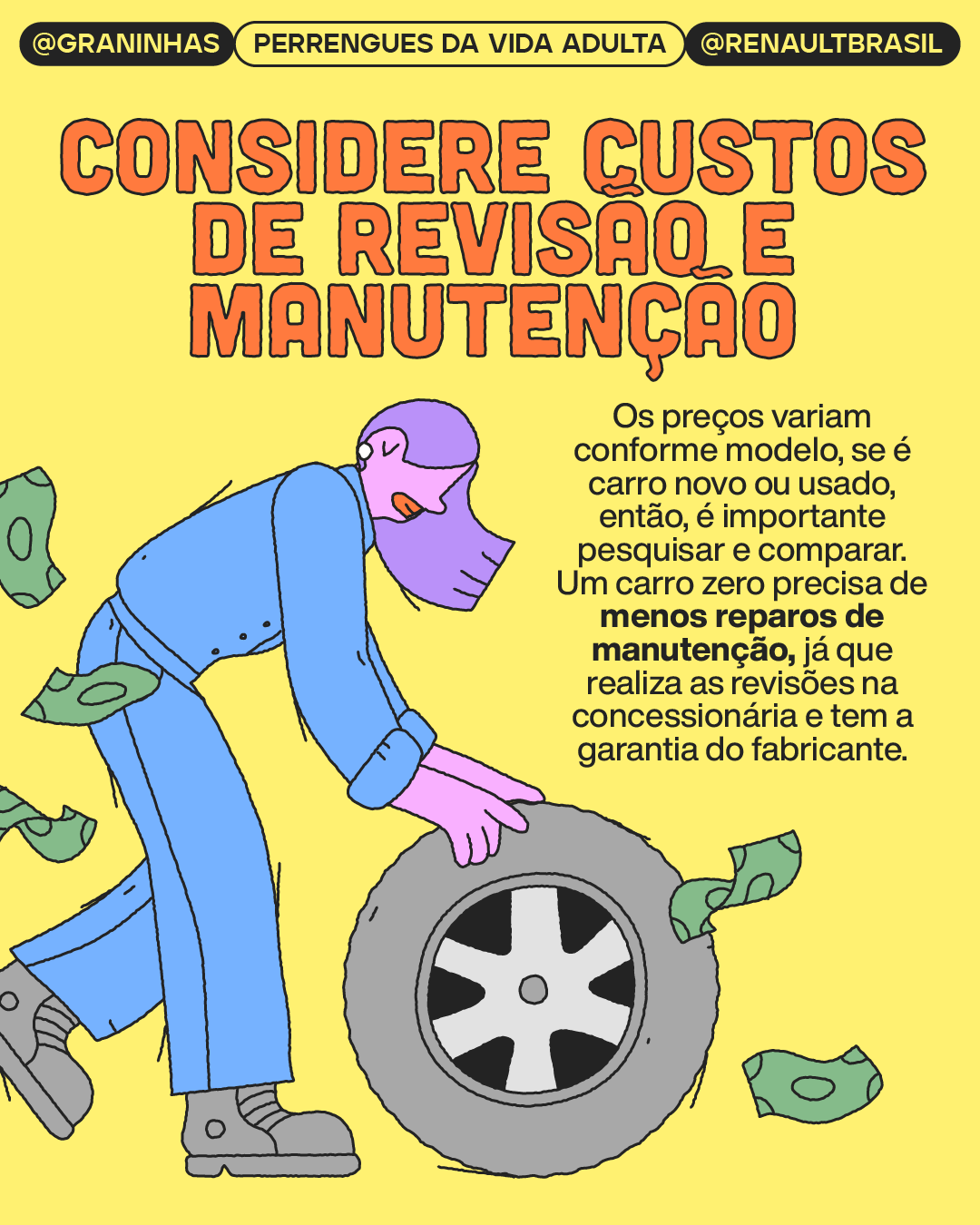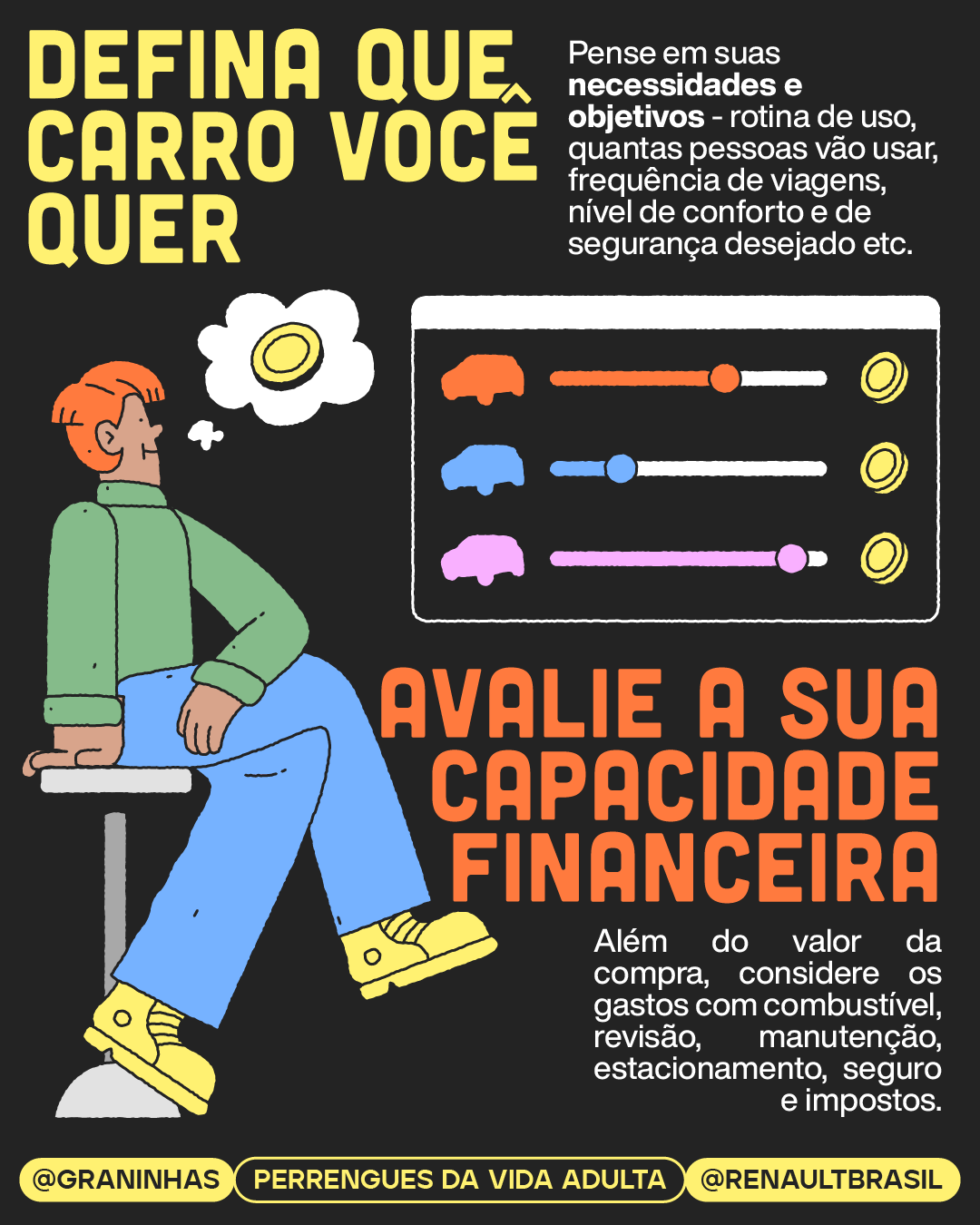 Ilustrações e diagramação em carrossel para redes sociais produzidos para a collab Graninhas + Renault Brasil no Instagram.