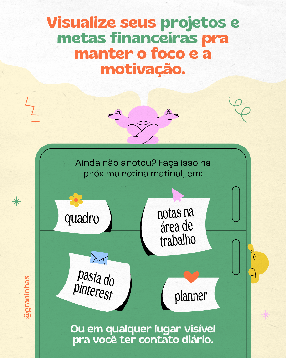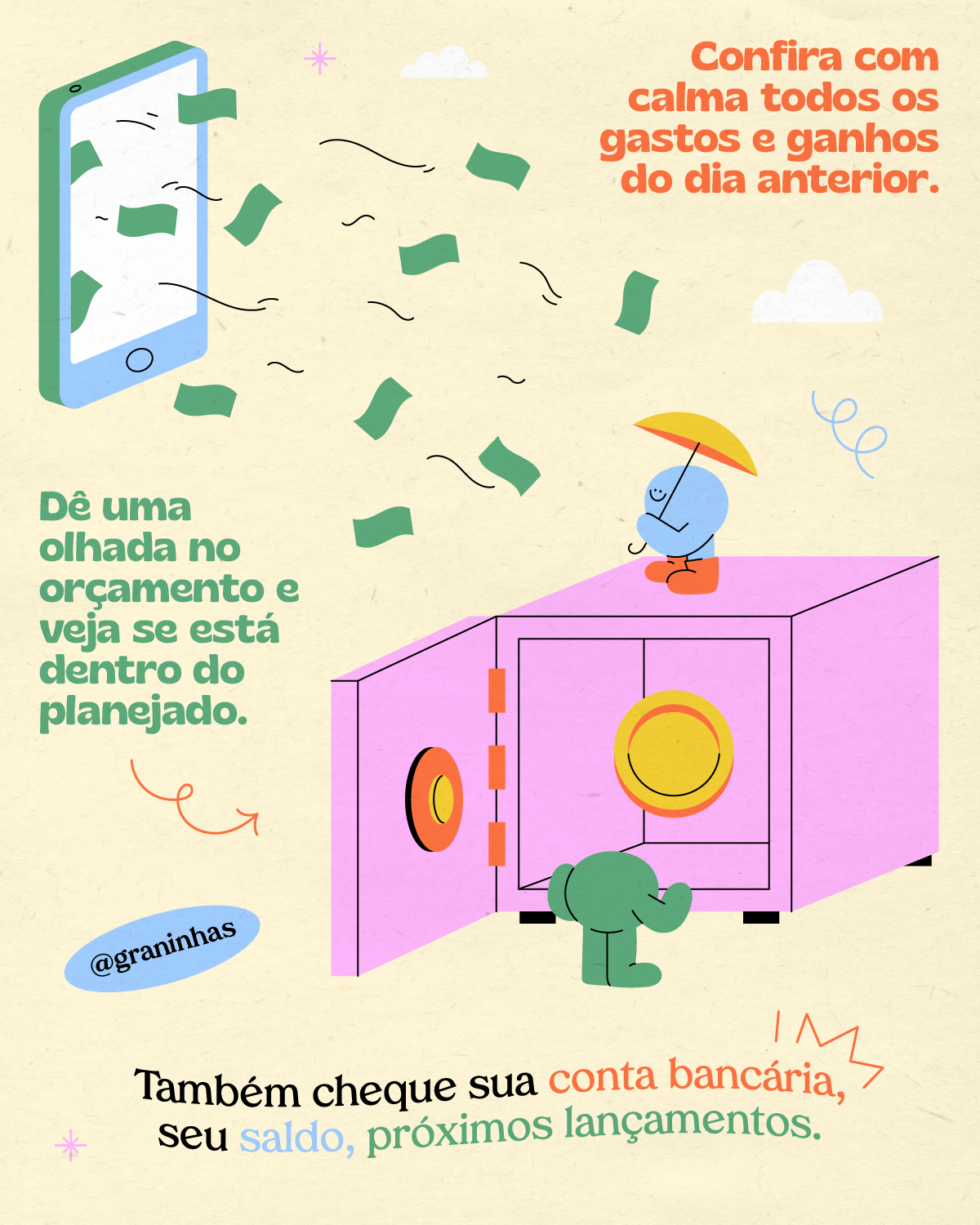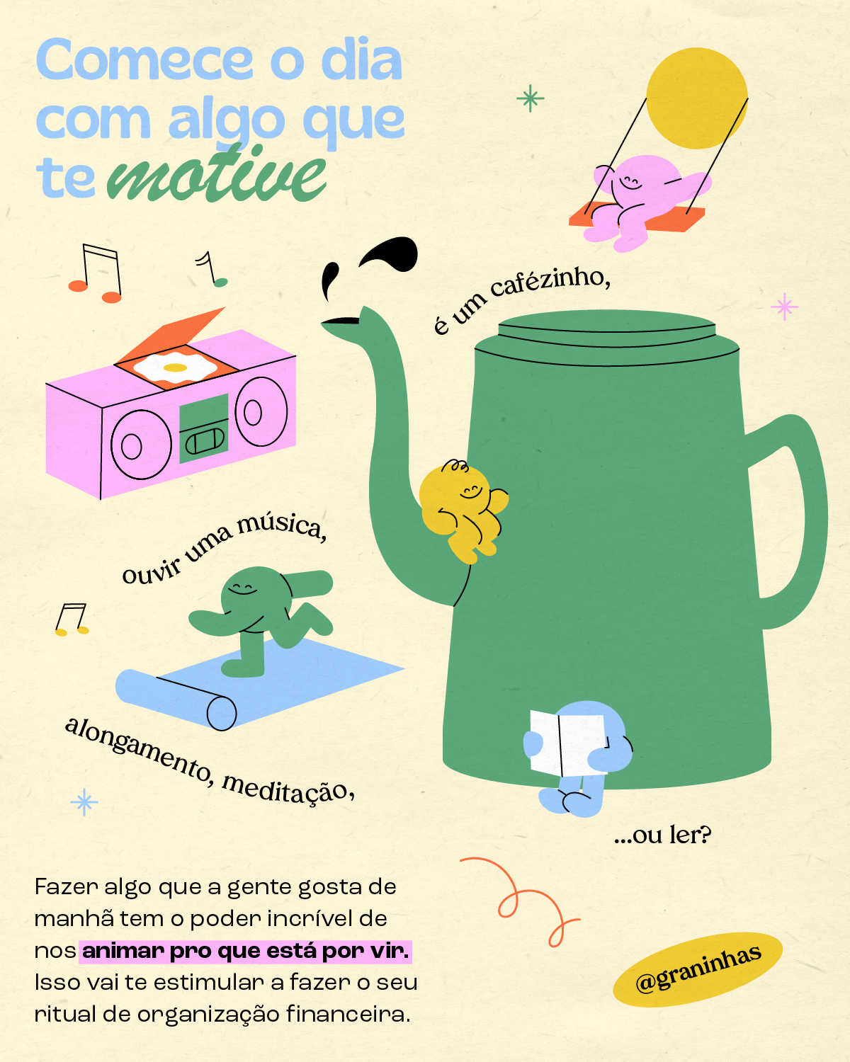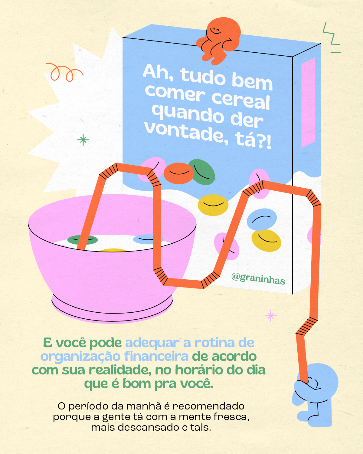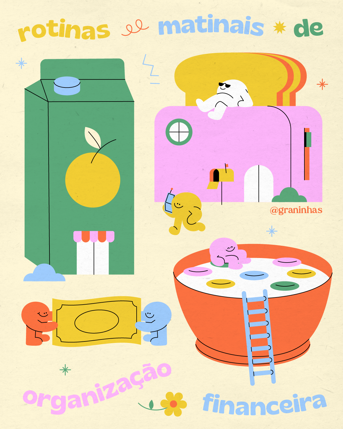Ilustrações e diagramação em carrossel para redes sociais produzidos para o post "Rotinas Matinais de Organização Financeira", do @graninhas no Instagram.