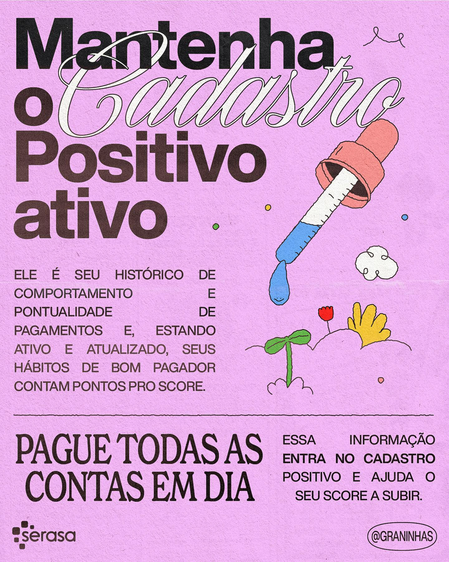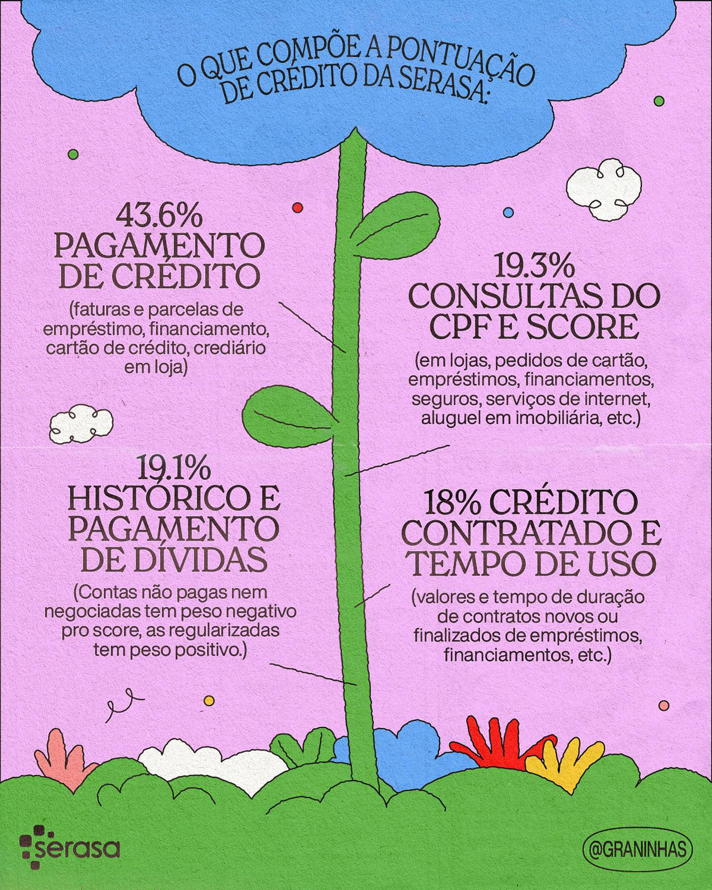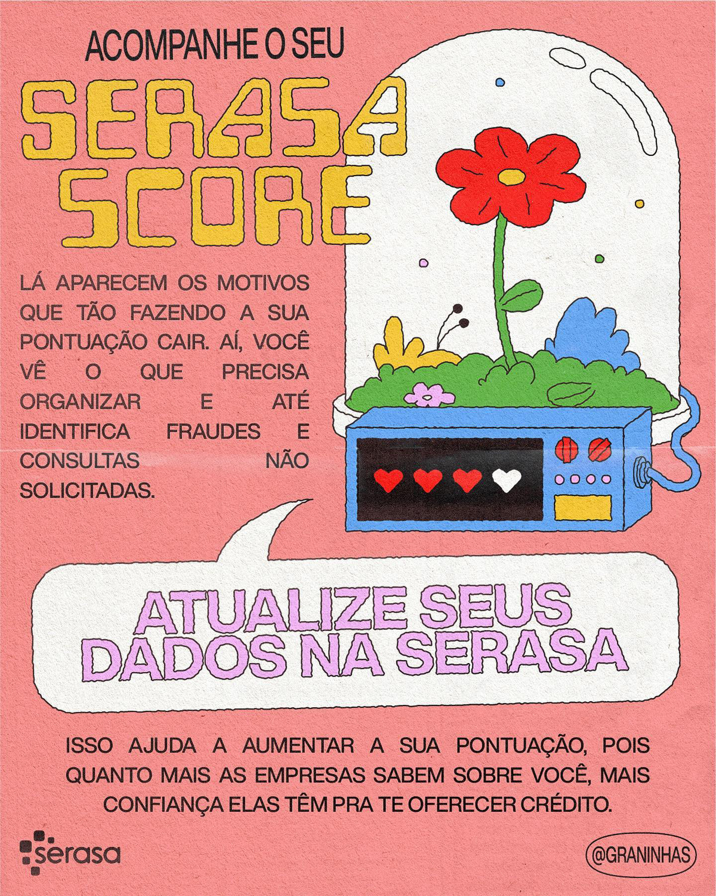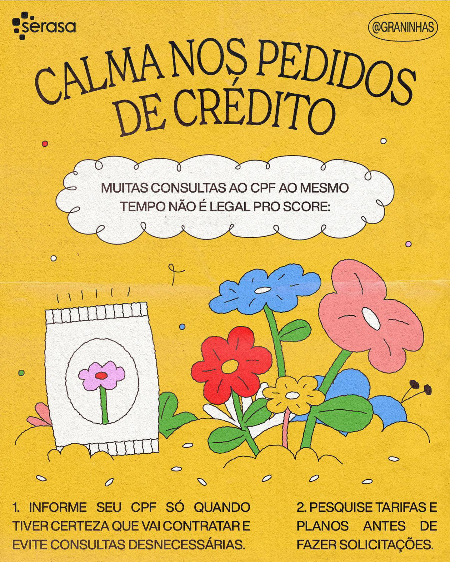 Ilustrações e diagramação em carrossel para redes sociais produzidos para a collab Graninhas + Serasa no Instagram.